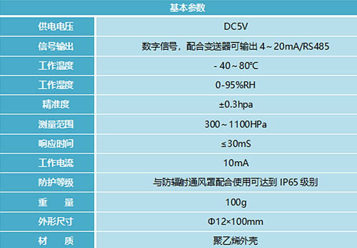 氣壓是作用在單位面積上的大氣壓力,即等于單位面積上向上延伸到大氣上界的垂直空氣柱的重量。氣象上使用的所有氣壓表的刻度均應(yīng)以hPa分度。在標(biāo)準(zhǔn)條件下,760mmHg的氣壓等于1032.25hPa。 QA-1型氣壓傳感器采用國(guó)外壓阻式傳感器芯片封裝,經(jīng)精密溫度補(bǔ)償,具有高精度﹑高靈敏度的特點(diǎn)??蓱?yīng)用于空氣壓力,海拔高度的測(cè)量是自動(dòng)氣象站的配套產(chǎn)品。