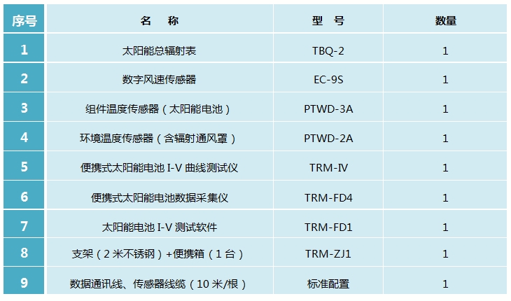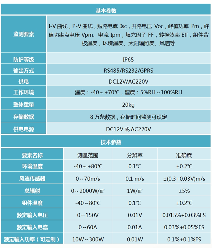 2、可測量參數(shù): I-V曲線,P-V曲線,短路電流,開路電壓,峰值功率,峰值功率點電壓、電流,填充因子,轉(zhuǎn)換效率,組件背板溫度,環(huán)境溫度、太陽輻照度、風速等。