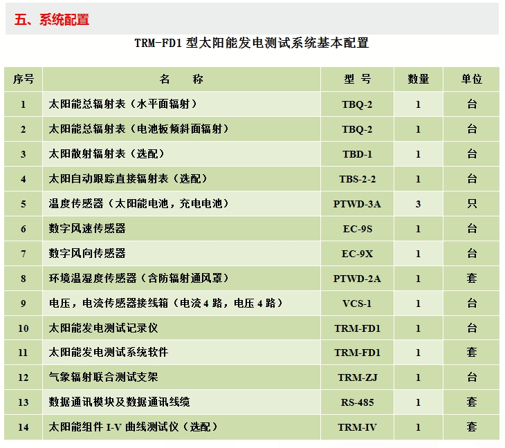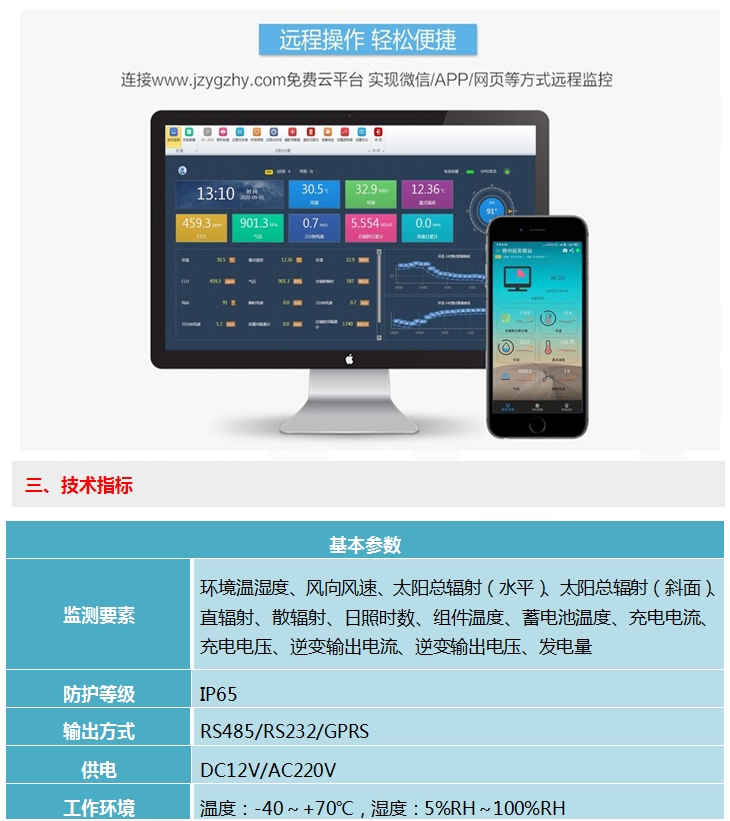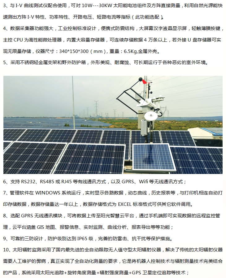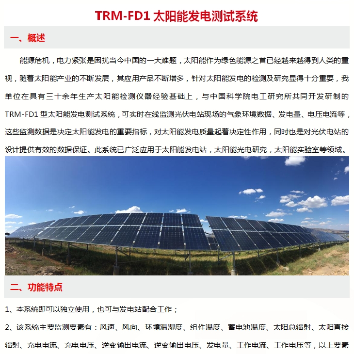 TRM-FD1型太陽能發(fā)電測試系統(tǒng),可實時在線監(jiān)測光伏電站現(xiàn)場的氣象環(huán)境數(shù)據(jù)、發(fā)電量、電壓電流等,這些監(jiān)測數(shù)據(jù)是決定太陽能發(fā)電的重要指標,對太陽能發(fā)電質(zhì)量起著決定性作用,同時也是對光伏電站的設(shè)計提供有效的數(shù)據(jù)保證。