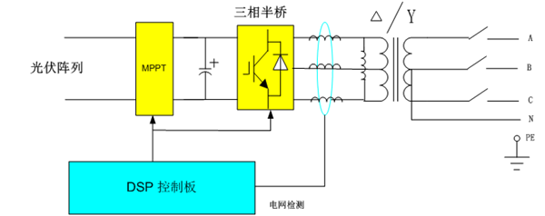 并網(wǎng)逆變電源通過三相半橋變換器,將光伏陣列的直流電壓變換為高頻的三相斬波電壓,并通過濾波器濾波變成正弦波電壓接著通過三相變壓器隔離升壓后并入電網(wǎng)發(fā)電。為了使光伏陣列以最大功率發(fā)電,在直流側(cè)加入了先進的MPPT算法。