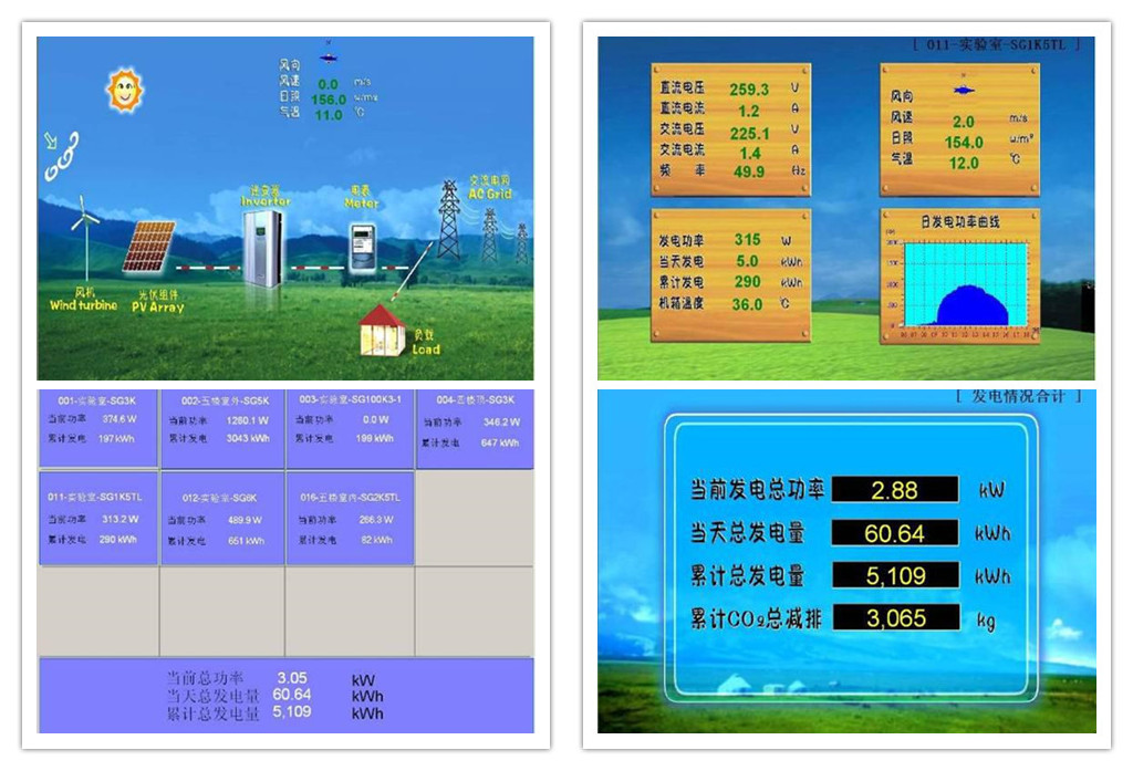 實時顯示電站的當(dāng)前發(fā)電總功率、日總發(fā)電量、累計總發(fā)電量、累計CO2總減排量以及每天發(fā)電功率曲線圖。