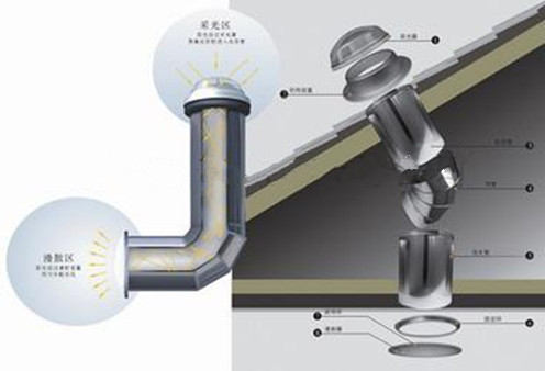 作為一種無(wú)電照明系統(tǒng),導(dǎo)光管照明系統(tǒng)是通過(guò)室外的采光裝置捕獲室外的日光,并將其導(dǎo)入系統(tǒng)內(nèi)部,然后經(jīng)過(guò)導(dǎo)光管裝置強(qiáng)化并高效傳輸后,由漫射器將自然光均勻?qū)胧覂?nèi)需要光線的任何地方。從黎明到黃昏,甚至是陰天或雨天,該照明系統(tǒng)導(dǎo)入室內(nèi)的光線仍然十分充足。該裝置主要由三部分組成:室外屋頂?shù)牟晒庋b置、導(dǎo)光管傳輸部分、室內(nèi)頂部的漫射器。