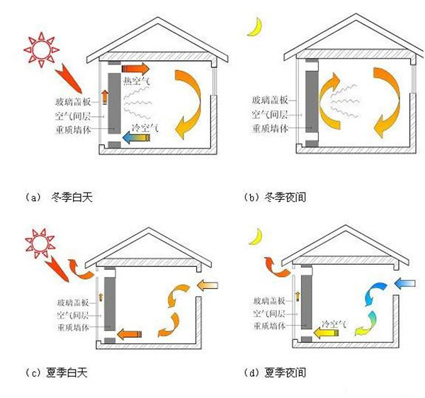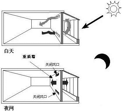 特朗伯集熱墻是一種依靠墻體獨(dú)特的構(gòu)造設(shè)計(jì),無(wú)機(jī)械動(dòng)力、無(wú)傳統(tǒng)能源消耗、僅僅依靠被動(dòng)式收集太陽(yáng)能為建筑供暖的集熱墻體。它由法國(guó)太陽(yáng)能實(shí)驗(yàn)室主任FelixTrombe教授及其合作者首先提出并實(shí)驗(yàn)成功的,故通稱為T(mén)rombewall(特朗伯墻)。特朗伯墻在冬、夏兩季以及白天、夜晚的工作運(yùn)行原理及要求均有所差別。