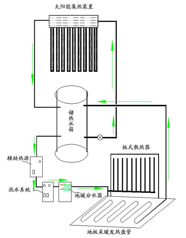 太陽(yáng)能集熱器采集太陽(yáng)的能量,把冷水逐漸加熱,儲(chǔ)存在保溫水箱內(nèi),待需要取暖時(shí)開(kāi)啟加以利用,把水箱內(nèi)儲(chǔ)存的熱能通過(guò)地暖管路內(nèi)熱水的循環(huán)對(duì)室內(nèi)空間進(jìn)行釋放熱能,將室內(nèi)的冷空氣加熱,來(lái)提高室內(nèi)空間的環(huán)境溫度。滿足需要。太陽(yáng)能采暖系統(tǒng)由太陽(yáng)能集熱器(平板太陽(yáng)能集熱器、真空管太陽(yáng)能集熱器、U型管太陽(yáng)能集熱器、熱管太陽(yáng)能集熱器)、水箱、連接管道、控制系統(tǒng)等輔材構(gòu)成。將分散的太陽(yáng)能通過(guò)集熱器,把太陽(yáng)能轉(zhuǎn)換成熱水,將熱水儲(chǔ)存在水箱內(nèi),然后通過(guò)熱水輸送到地暖管路,提供建筑供熱的需求。