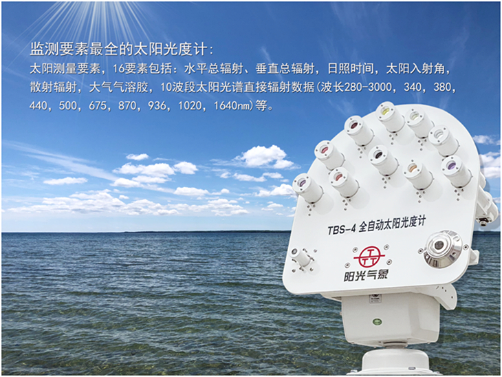 監(jiān)測10波段太陽直接輻射,太陽總輻射、散射輻射、日照時數(shù)、太陽高度角、經(jīng)度、緯度、海拔高度、大氣氣溶膠厚度、9波段天空光等