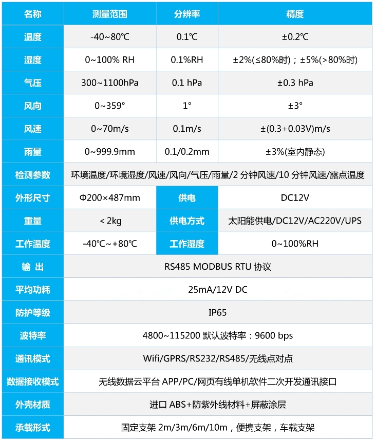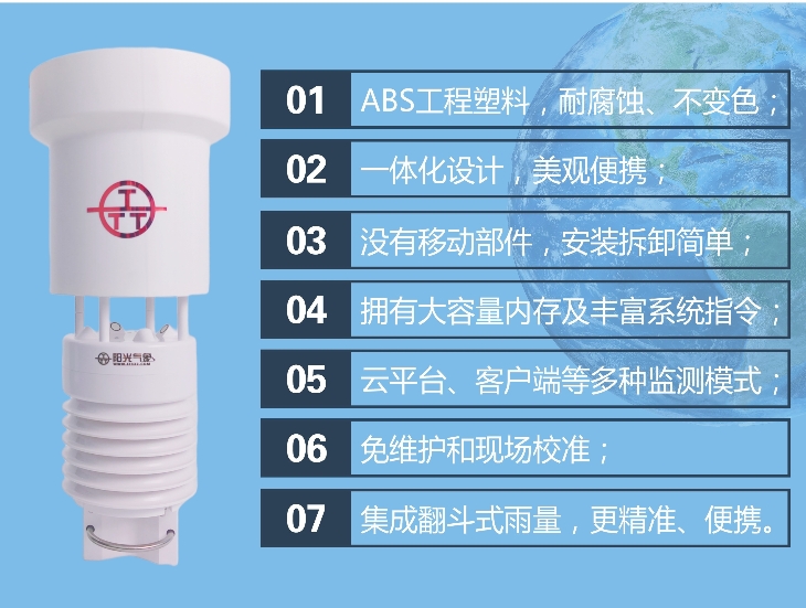 PC-8K氣象六參數(shù)環(huán)境監(jiān)測儀是我公司自主研制的一款測量多種氣象要素的一體化氣象站,可同時測量大氣溫度、大氣濕度、風速、風向、氣壓、雨量等主要氣象要素。其中雨量為高精度翻斗式雨量傳感器,其特點是精度高,響應速度快,串口輸出,方便用戶直接通過PC或外接儀器進行采集。