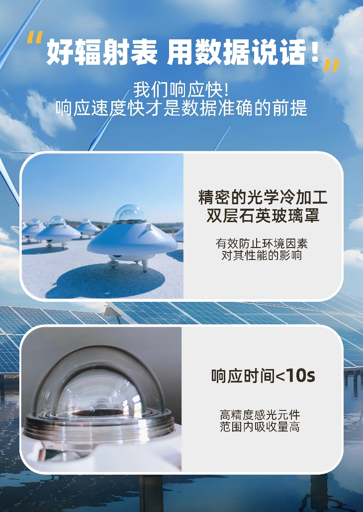 2、響應(yīng)快:響應(yīng)時間≤10S,對太陽輻射的微小變化都能迅速響應(yīng),確保數(shù)據(jù)的實(shí)時性和準(zhǔn)確性。