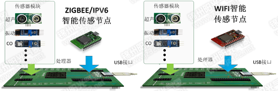 每個節(jié)點基于"傳感器+處理器"的架構,可以獨立運行,配合20 多種傳感器模塊,滿足物聯(lián)網(wǎng)專業(yè)"智能傳感器"相關課程的教學實驗。