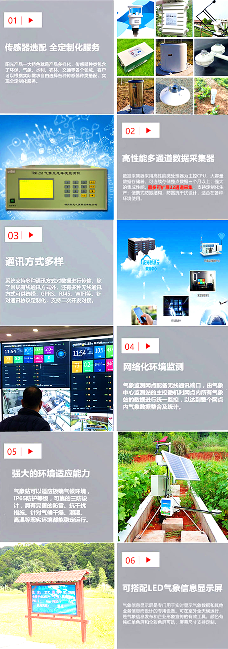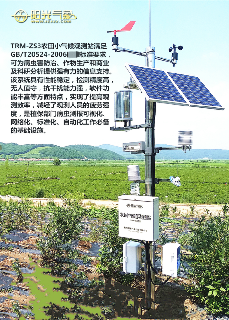 TRM-ZS3農(nóng)田小氣候觀(guān)測(cè)站滿(mǎn)足GB/T 20524-2006標(biāo)準(zhǔn)要求,可為病蟲(chóng)害防治、作物生產(chǎn)和商業(yè)及科研分析提供強(qiáng)有力的信息支持。該系統(tǒng)具有性能穩(wěn)定,檢測(cè)精度高,無(wú)人職守,抗干擾能力強(qiáng),軟件功能豐富等方面特點(diǎn),實(shí)現(xiàn)了提高觀(guān)測(cè)效率,減輕觀(guān)測(cè)人員的勞動(dòng)強(qiáng)度,是植保部門(mén)病蟲(chóng)測(cè)報(bào)可視化、網(wǎng)絡(luò)化、標(biāo)準(zhǔn)化、自動(dòng)化工作必備的基礎(chǔ)設(shè)施。