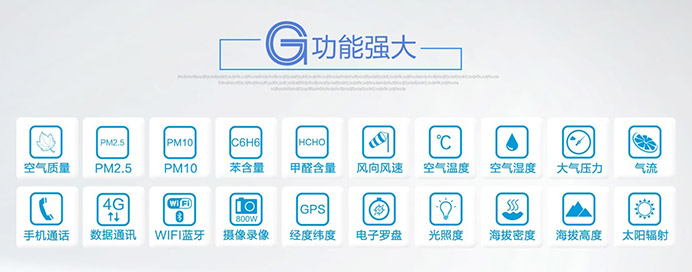 可測量要素為:風(fēng)速,風(fēng)向,氣流,環(huán)境溫度,環(huán)境濕度,氣壓,太陽輻射,紫外線強(qiáng)度,風(fēng)寒指數(shù),熱指數(shù),露點(diǎn),海拔高度,海拔密度,位置經(jīng)度緯度,電子羅盤,時間,GPS,CO2濃度,土壤水份/溫度、雨量、熱流等(用戶可根據(jù)使用要求選配以上測量要素)。