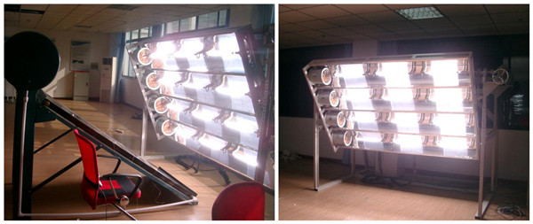 光源的均勻性是太陽模擬器的重要指標(biāo),一般通過調(diào)整每只光源的亮度與位置只能改變大的均勻誤差。但精密均勻性調(diào)整必須通過光源均光板完成。其采用不銹鋼材料,耐高溫,不影響光譜質(zhì)量,尺寸:2.2米*2.2米 安裝在距離光源 0.6米的矩陣式發(fā)光裝置上,經(jīng)過均光板發(fā)出的光源均勻性較好,照射集熱器表面,滿足試驗(yàn)要求。
