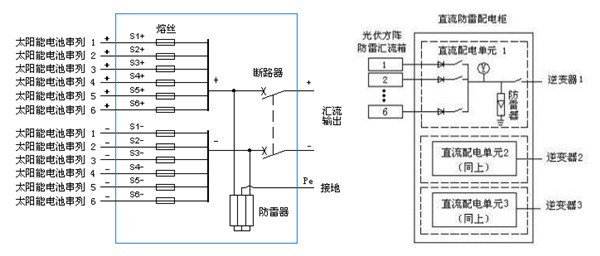為了將光伏陣列防雷匯流箱的直流輸出匯流后再接入逆變器,系統(tǒng)需要配置1個直流防雷配電柜