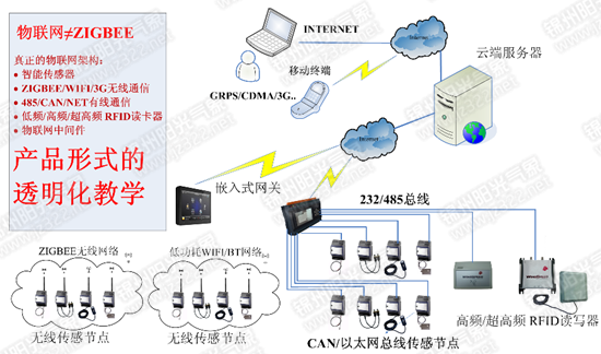基于工程方案可以實現(xiàn)通用的物聯(lián)網(wǎng)網(wǎng)絡(luò)架構(gòu),在傳感層通過無線組網(wǎng)或現(xiàn)場總線組網(wǎng)實現(xiàn)對各種物理量的傳感采集和反饋控制,通過RFID讀寫器實現(xiàn)對人或物體的ID識別,通過視頻圖像采集設(shè)備實現(xiàn)環(huán)境圖像數(shù)據(jù)獲取,數(shù)據(jù)通過網(wǎng)關(guān)轉(zhuǎn)換為標(biāo)準(zhǔn)的網(wǎng)絡(luò)數(shù)據(jù)流匯聚到云端服務(wù)器,在服務(wù)器端實現(xiàn)數(shù)據(jù)的智慧處理,再由服務(wù)器通過Internet或3G網(wǎng)絡(luò)實現(xiàn)廣域的數(shù)據(jù)發(fā)布,與各種終端,包括手機實現(xiàn)智能的交互與管理。