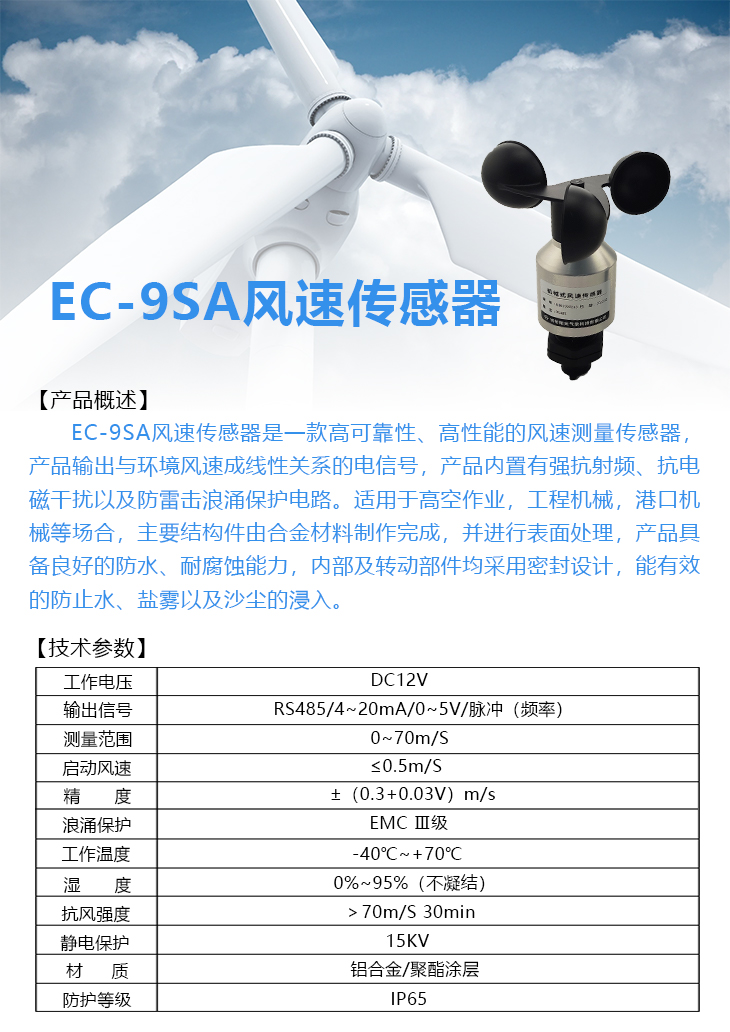 EC-9SA風(fēng)速傳感器是一款高可靠性、高性能的風(fēng)速測(cè)量傳感器,產(chǎn)品輸出與環(huán)境風(fēng)速成線(xiàn)性關(guān)系的電信號(hào),產(chǎn)品內(nèi)置有強(qiáng)抗射頻、抗電磁干擾以及防雷擊浪涌保護(hù)電路。適用于高空作業(yè),工程機(jī)械,港口機(jī)械等場(chǎng)合,主要結(jié)構(gòu)件由合金材料制作完成,并進(jìn)行表面處理,產(chǎn)品具備良好的防水、耐腐蝕能力,內(nèi)部及轉(zhuǎn)動(dòng)部件均采用密封設(shè)計(jì),能有效的防止水、鹽霧以及沙塵的浸入。