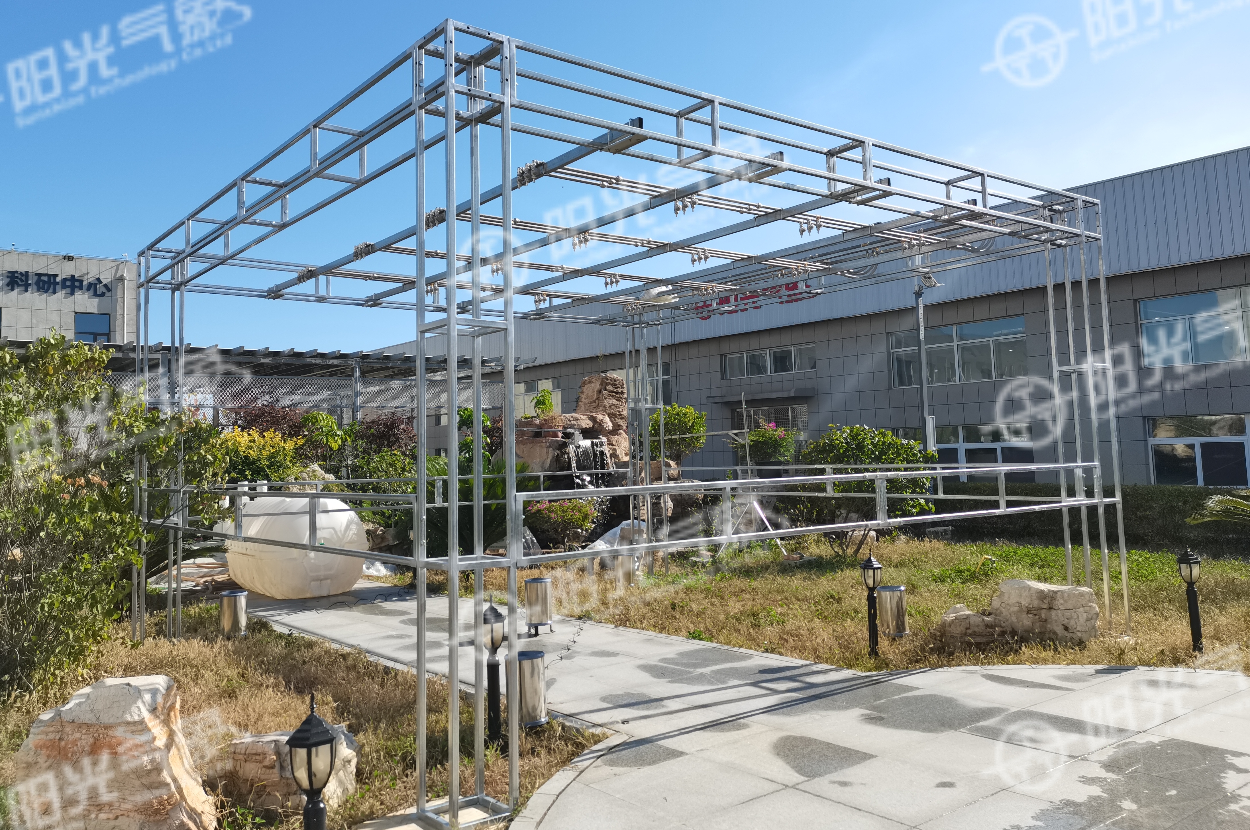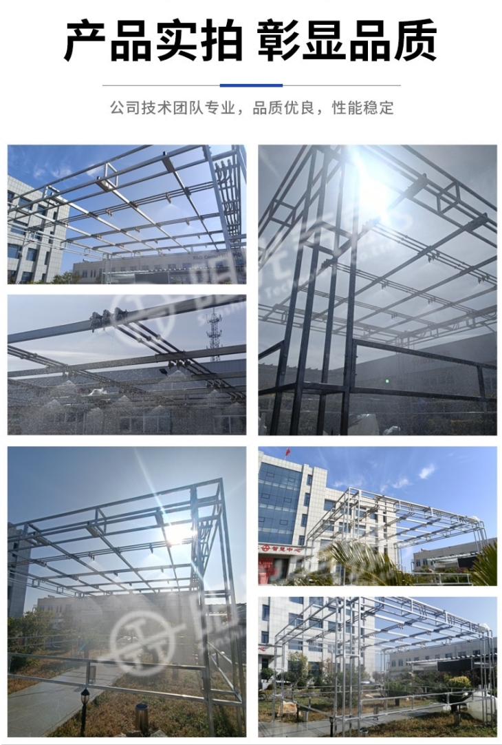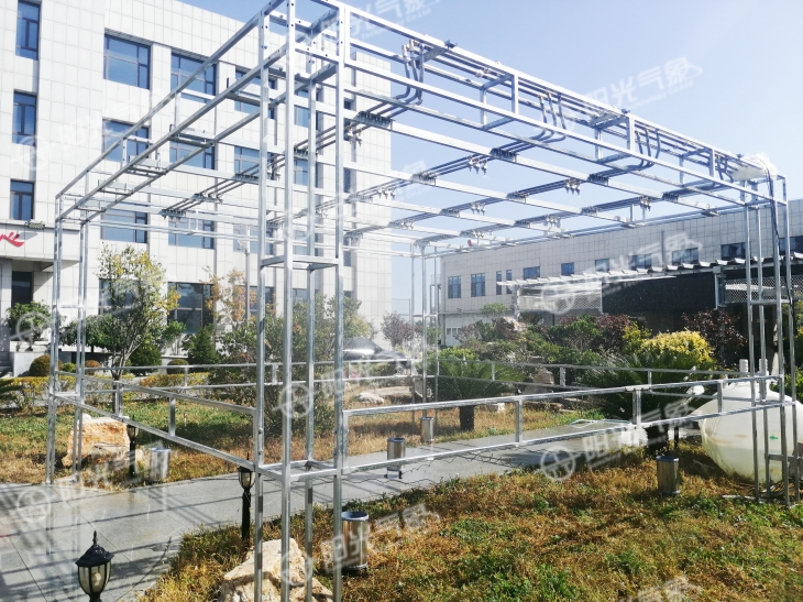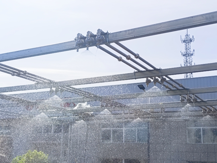 噴霧單元由供水管路、直管段、噴嘴、支架等組成,噴嘴采用專業(yè)模擬雨滴噴頭——旋轉(zhuǎn)下噴式噴嘴,不銹鋼材質(zhì),噴嘴和直管段集成在一起,噴霧支架為不銹鋼方管結(jié)構(gòu),用來架設(shè)供水管路和噴嘴。噴霧單元設(shè)計噴霧量為200~1000L/H,噴霧壓力0.5~3Bar,噴霧高度和覆蓋面積可按用戶需求進(jìn)行定制。